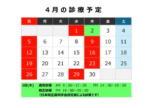 午前9:00~12:00 午後14:30~19:00は通常診療、午後19:00~20:00は矯正診療のみとなります。